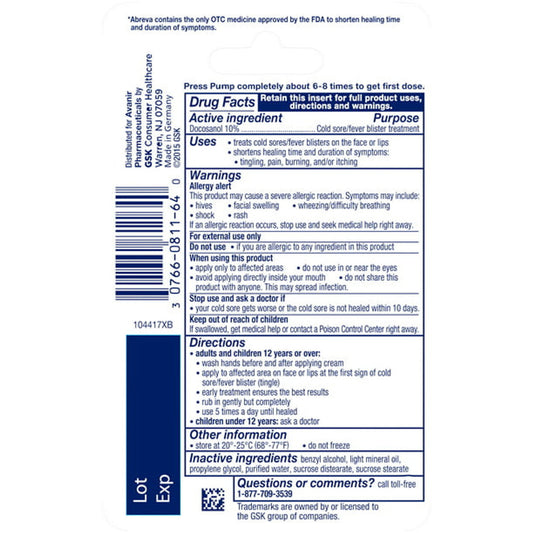 Abreva Cold Sore/Fever Blister Treatment Cream Pump 0.07 oz