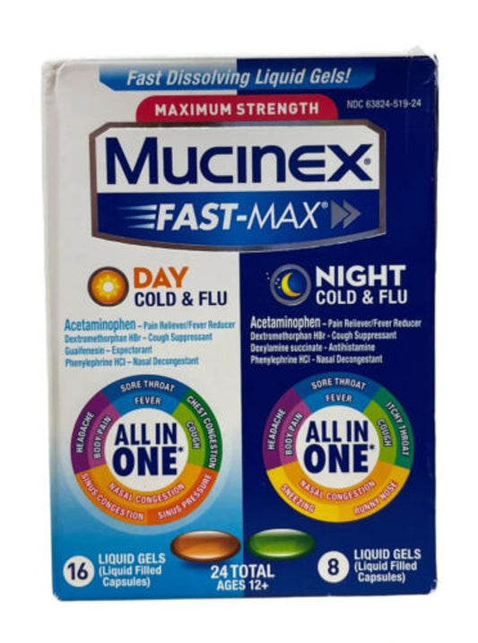 Mucinex Max Strength Fast-Max Day Cold & Night Cold Flu 24 Liquid Gels Pack of 2